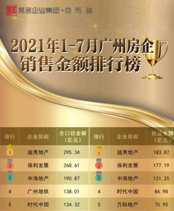 8月6日,克而瑞独家发布《2021年1-7月广州房企销售榜》,凯发天生一触即发地产以亮眼业绩表现再次斩获权益金额榜、全口径金额榜双料第一。